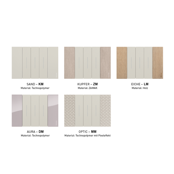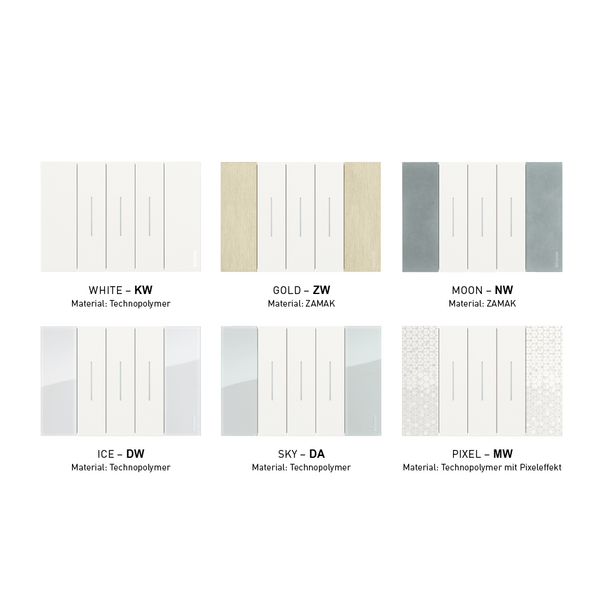 • 3 Farben für die Abdeckungen: Die Abdeckungen, wie z. B. Wippen und Steckdosenfrontblenden, sind in 3 verschiedenen Farben erhältlich: White, Sand und Black. Die satinierte Oberfläche sorgt für ein angenehmes Bediengefühl.